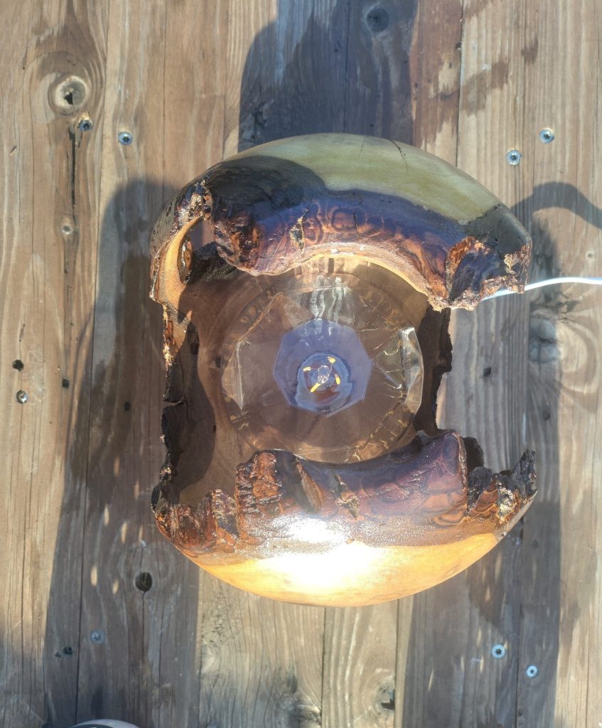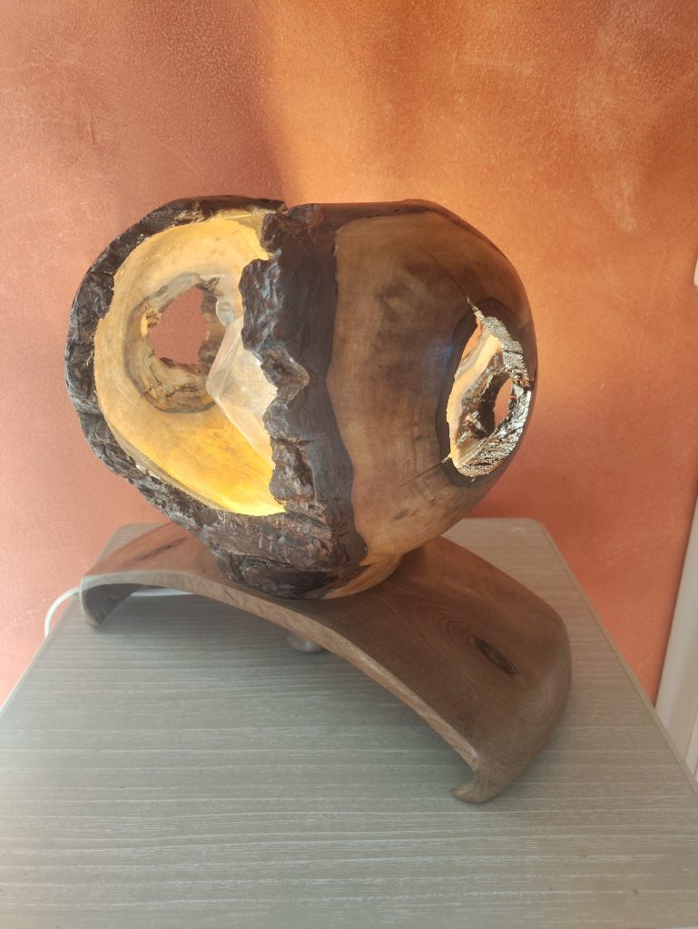 Ici c’est une pièce de vieux noyer, devenue une lampe décorative, après de longues heures de travail et de réflexion .“