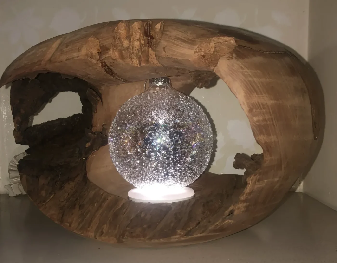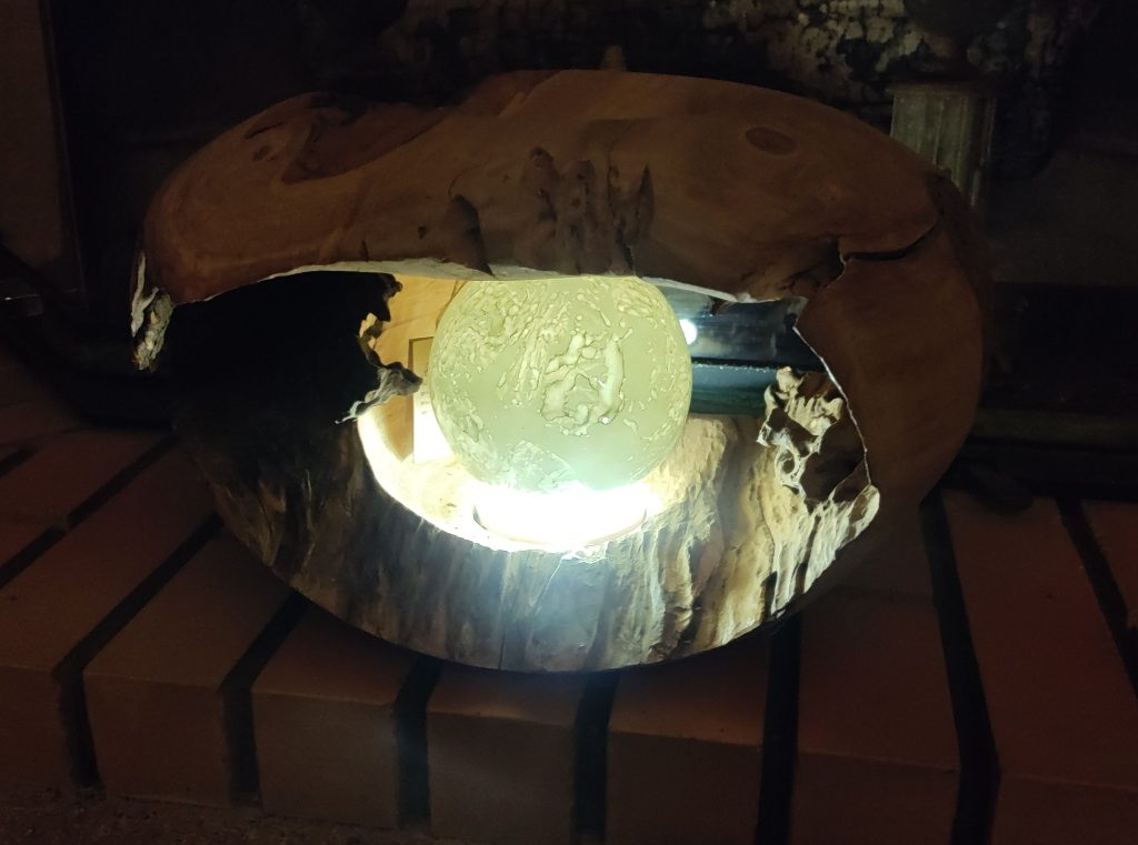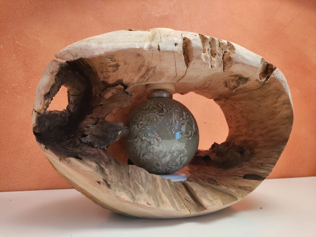 Ensuite, attente du séchage…. Le “bouchon” du dessus -qui sert a tenir et soulever la sphère en verre pour accéder à la lampe LED, allumage au contact – est en buis.